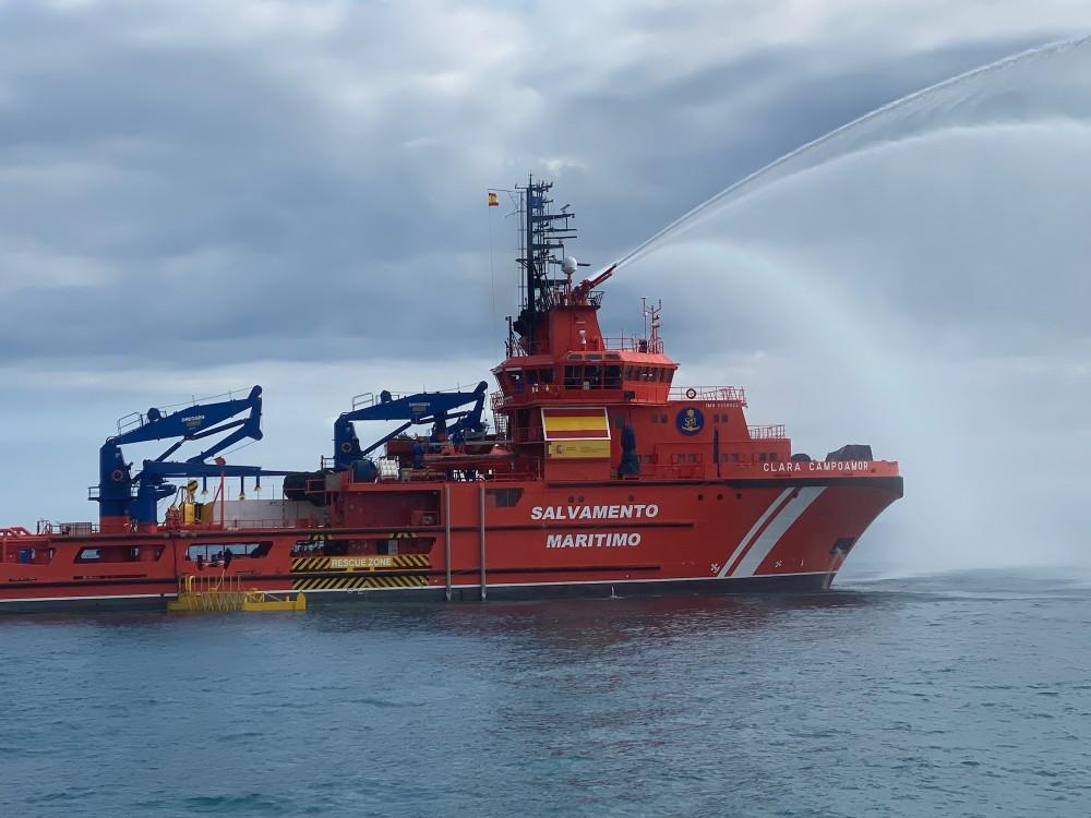 Finalmente, también se ha comprobado la forma en la que hubiera actuado el buque Clara Campoamor con sus cañones de agua y sus palas para la recogida de combustible.