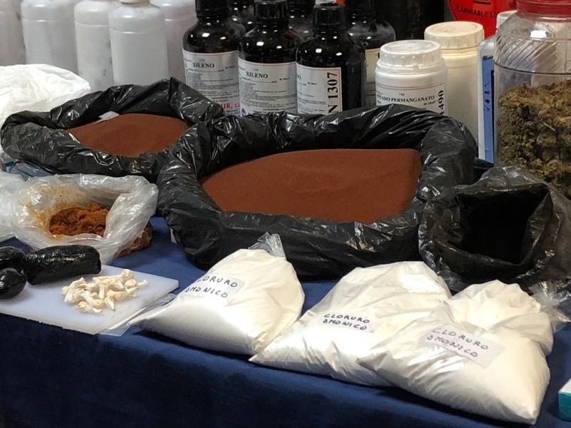 El laboratorio contaba, con el surtido de drogas, los químicos necesarios para su preparación (precursores) y además, prensas hidráulicas, planchas de distintos tamaños, bolsas de envasado al vacío, balanzas de precisión, alambre de cierre, Logotipo (para marcar los paquetes de cocaína), barreños para la extracción de la cocaína, papel secante.