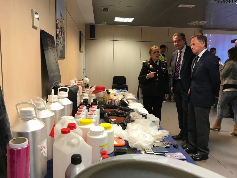 Finalmente, el miércoles pasado fueron detenidas dos personas de 38 y 46 años de edad, realizándose el registro en el domicilio sobre el que se centraban las pesquisas, encontrándose 10 kilos de cocaína, 2 kilos de marihuana, 100 gramos de hachis y anabolizantes, así como más de 200 litros sustancias precursoras (sustancias químicas como la efedrina, el anhídrido acético o el ácido sulfúrico, entre otras, que, debido a su composición, pueden desviarse de su uso legal -antigripales, plásticos o fertilizantes, entre otros productos muy corrientes en nuestra sociedad- y, en su lugar, utilizarse en la elaboración de distintos tipos de drogas: anfetaminas, cocaína, heroína,..), básicos para la extracción y posterior adulteración de la cocaína.