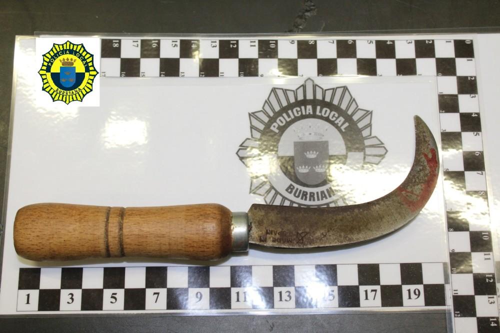 Identificados implicados y testigos, del examen del lugar resultó el hallazgo de una herramienta agrícola de corte, concretamente una hoceta o podón de vendimiar de unos 20 centímetros, con una hoja curva de 13cm, que además presentaba restos de sangre. El herido fue trasladado al centro de salud de Borriana para ser asistido de las diferentes heridas y de su estado de agitación y ansiedad. El agresor (S.F.T), previa información de sus derechos, fue detenido y trasladado al Puesto Principal de la Guardia Civil de Borriana, para su posterior puesta a disposición judicial como presulto responsable de un delito de lesiones.