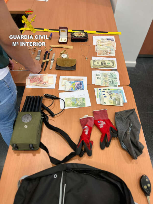 El detenido llevaba una mochila con billetes de diferentes divisas, joyas, joyeros, relojes y un inhibidor de frecuencia activo, destornilladores, un teléfono móvil, un par de guantes y una linterna tipo led.