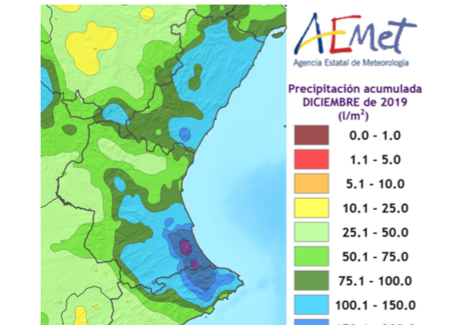 El resumen climático del mes de diciembre de 2019 en la Comunidad Valenciana arroja que ha sido un mes que ha resultado muy húmedo y extremadamente cálido. La temperatura media, 10.8 ºC, es 2.1 ºC superior que la de la climatología de referencia (8.7 ºC), y la precipitación acumulada ha sido 91.9 l/m2, que es un 84% superior que la del promedio climático del periodo 1981-2010 (49.9 l/m2).