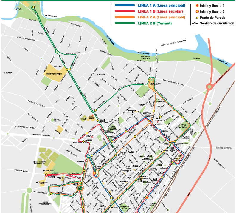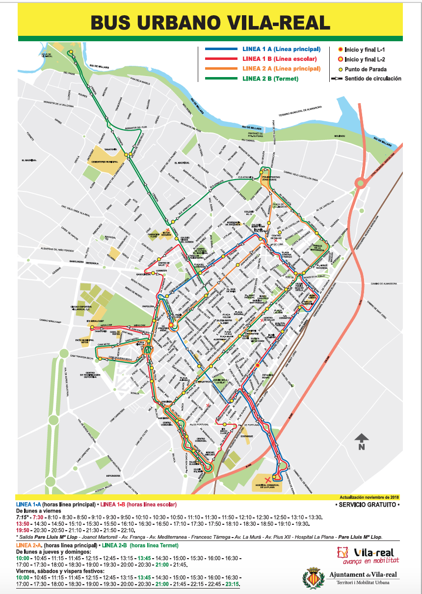 El bus –de color groc per a facilitar la seua identificació- forma part del primer Pla de Mobilitat Urbana Sostenible elaborat amb la participació ciutadana. Els dos vehicles circularan durant tot el dia de dilluns a divendres i caps de setmana, vertebraran i comunicaran les àrees més externes de Vila-real, com el Madrigal i el Termet, amb els punts més cèntrics, centres públics i docents, sense oblidar la connexió amb l'Hospital de la Plana