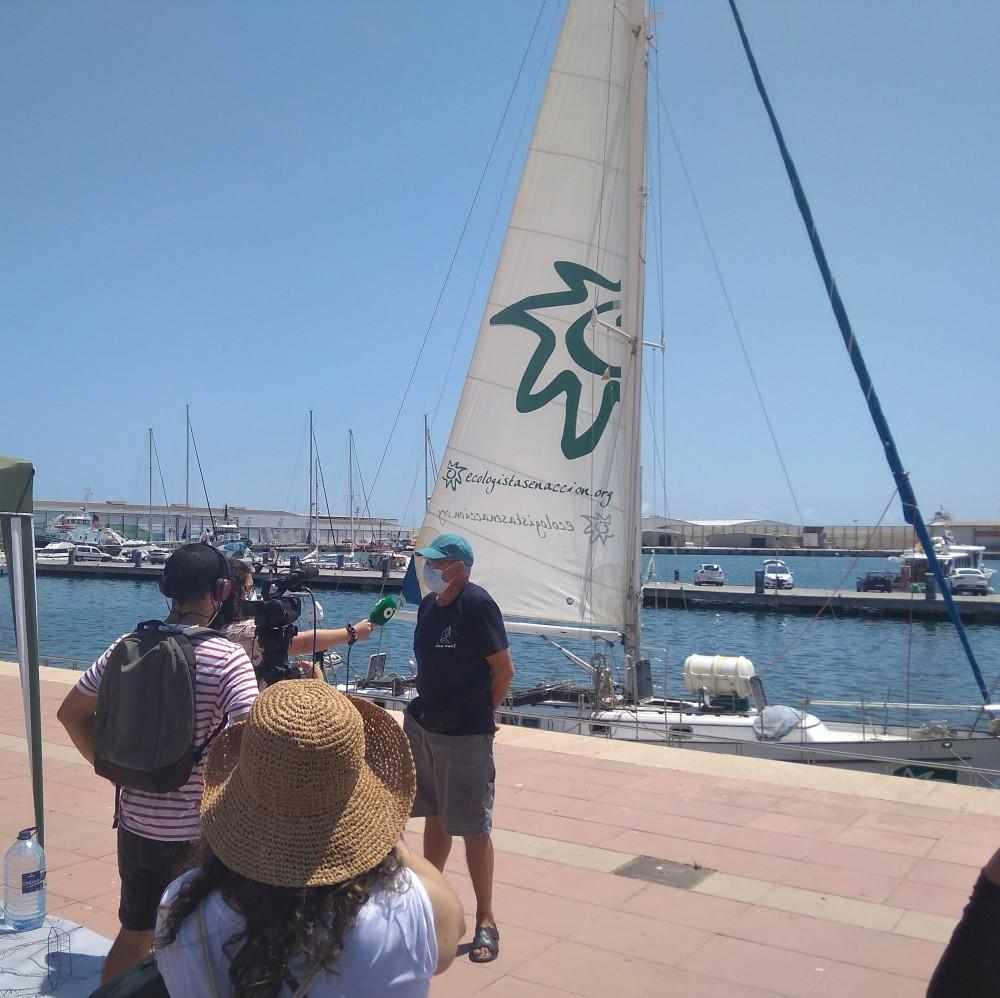 La campaña Mediterráneo en Acción, denominada aquí en Castellón: “Defensem el Territori!!!”, comenzó ayer con una rueda de prensa en el Puerto, en el paseo frente al Faro, donde está atracado el velero.