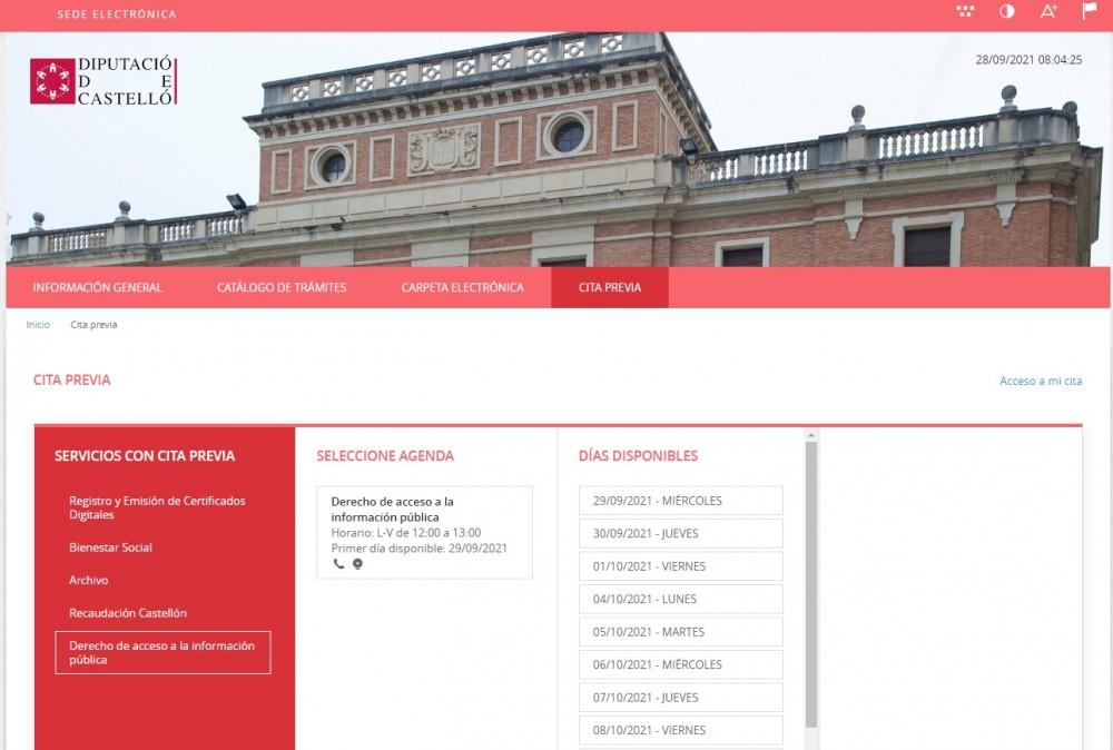 La Diputació Provincial de Castelló, donada la importància d'aquest dret (contemplat en la nostra legislació estatal i autonòmica), ha incorporat per primera vegada en la seua seu electrònica la modalitat de cita prèvia per a facilitar aquest accés, cita que podrà ser telefònica o per videoconferència.