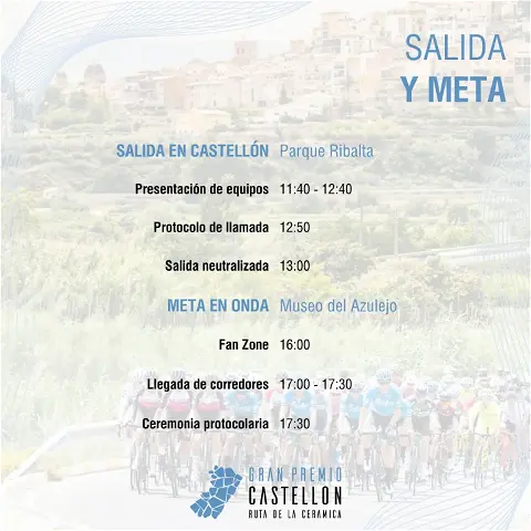 A las 11.30 horas se iniciará la presentación de equipos y, después de conocer a los 19 equipos y más de 130 ciclistas, todo estará listo para dar el pistoletazo de salida a las 12.50 horas de forma neutralizada. Unos minutos antes, todas las autoridades con Marta Barrachina, presidenta de la Diputación de Castellón a la cabeza, y la alcaldesa de Castellón, Begoña Carrasco, realizarán el protocolario corte de cinta.