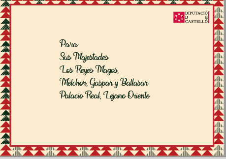 La Diputación de Castellón ha diseñado una carta especial para que los niños y niñas de la provincia pueden pedir sus juguetes y enviar todas sus peticiones a Sus Majestades los Reyes Magos. La misiva, con un diseño alegre y divertido, permitirá recoger así los deseos de los más pequeños de la casa, que así podrán plasmar sobre el papel todos aquellos regalos que más ilusión les hace para estas fiestas.