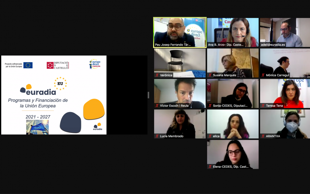El ciclo informativo ‘Fondos Europeos 2021-2027’ organizado por el centro Europe Direct de la Diputació de Castelló consta de un total de cuatro sesiones. Durante las tres semanas próximas, concretamente los jueves en horario de 10 h a 12.30 h, se llevarán a cabo las dirigidas a grupos de interés específicos.