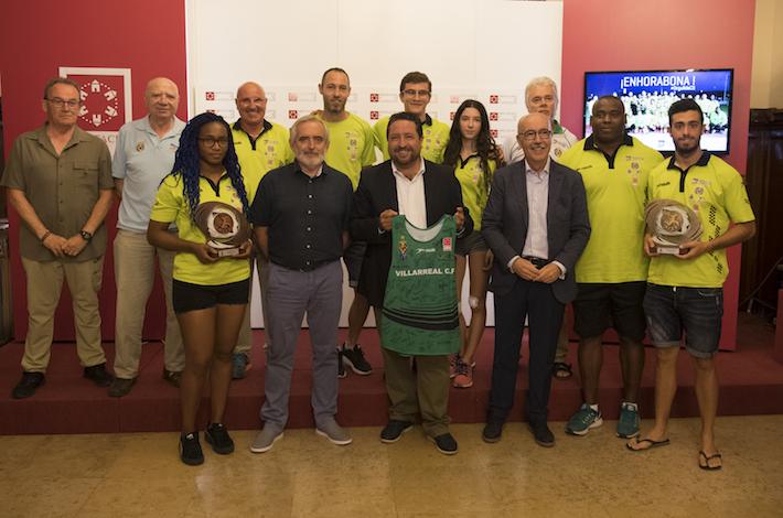 Javier Moliner, junto con el diputado de Deportes, Luis Martínez, se ha reunido hoy con el presidente del Playas de Castellón, Antonio Escrig, el director deportivo, José Ortuño, y una representación de sus atletas más destacados. Entre los atletas ha estado una representación de la cantera del club, que se ha formado en el CITD Penyeta Roja de la Diputación.