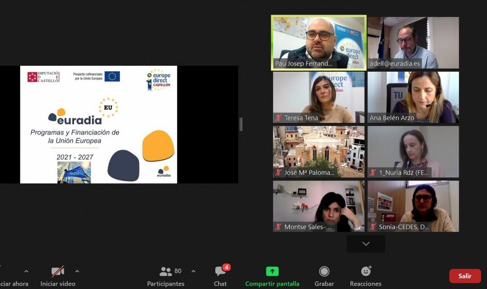 Esta mañana se han retomado las sesiones informativas en línea sobre financiación europea 2021-2027 organizadas por el centro Europe Direct de la Diputació de Castelló. En esta tercera jornada, a la cual se han inscrito más de 130 personas, se han dado a conocer las claves de las convocatorias relacionadas con el actual marco financiero y del fondo de resiliencia Next Generation destinadas a entidades privadas.