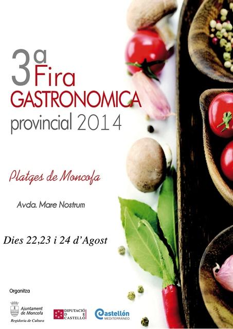 La Diputación de Castellón contribuye con la celebración, del 22 al 24 de agosto, de la tercera edición de la Feria Gastronómica Provincial que tendrá lugar en les Platges de Moncofa. Esta muestra es la única de carácter provincial que se realiza en todo el territorio castellonense, ocupa una superficie de 10.000 metros cuadrados y las previsiones de la organización es que supere la afluencia de 30.000 visitantes.
