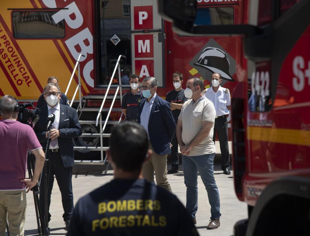 Ha sido uno de los temas que han tratado el presidente de la Diputación, José Martí, el Director General de la Agencia de Seguridad y Repuesta a las Emergencias (AVSRE) de la Generalitat Valenciana, José María Ángel, y el diputado provincial de Bomberos, Abel Ibáñez. Han presentado en la sede del Consorcio Provincial de Bomberos de Castellón (CPBC) el Plan de Lucha Contra los Incendios Forestales 2020, que en la provincia de Castellón constará de 750 efectivos, 200 vehículos y 5 medios aéreos (3 aviones Air Tractor y 2 helicópteros dotados de la Unidad Helitransportada de Bomberos Forestales). Se trata de un dispositivo formado por efectivos y medios propios del Consorcio Provincial y medios de la Generalitat, que trabajan perfectamente coordinados y del que forman parte los 9 parques de bomberos de la provincia (4 de profesionales y 5 de voluntarios), la Unidad de Maquinaria Logística (UML) y la Unidad de Voluntarios de Protección Civil de la Diputación, que tiene funciones preventivas y de apoyo logístico. También es importante destacar la Unidad de Mando y Coordinación (UMC), el camión que se utiliza como dentro de mando móvil.