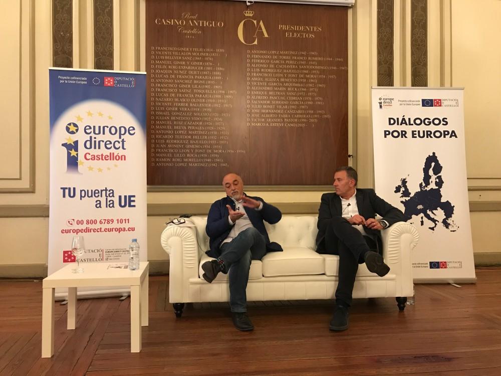 A través de un diálogo distendido con el vicepresidente y diputado de Relaciones Internacionales, Vicent Sales, ha acercado en su 'Trabajar en Europa', las oportunidades que abre, desde el punto de vista del mercado laboral, Europa, con la experiencia de quien dirige la compañía de teatro más internacional de la provincia. Y es que, tal y como ha asegurado el vicepresidente Sales al inicio de la sesión que ha tenido lugar en las instalaciones del Real Casino Antiguo de Castellón, "con estos diálogos lo que queremos es acercar a los castellonenses las distintas claves de Europa porque desde la UE se nos ofrecen multitud de recursos que podemos aprovechar en nuestros pueblos, en nuestras empresas, en nuestros centros educativos, para seguir sumando nuevas oportunidades a nuestro territorio".