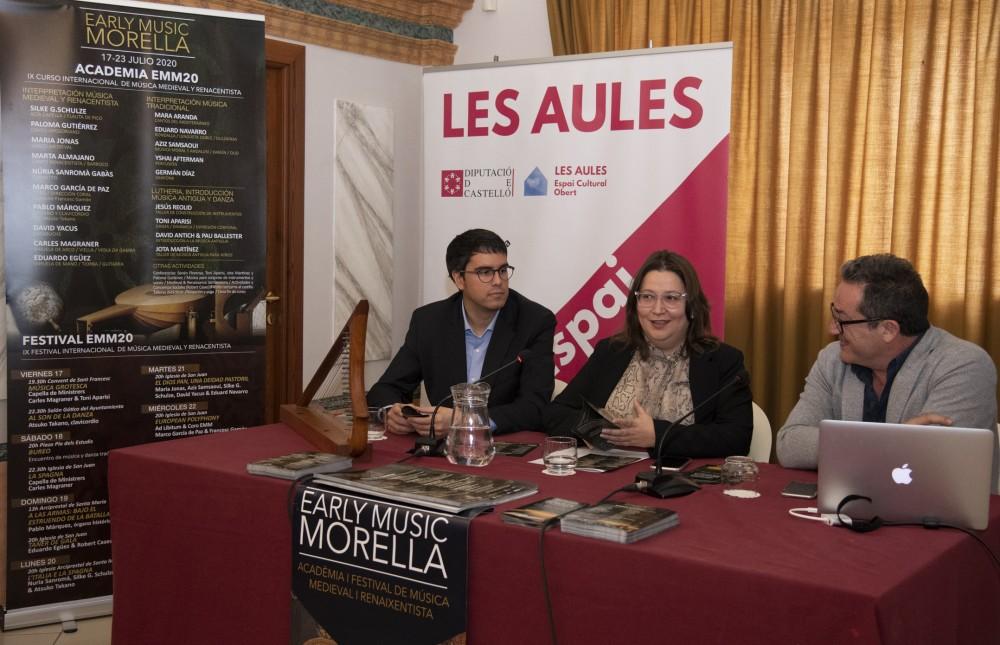 El Centro Cultural las Aulas de la Diputación de Castellón ha acogido hoy la presentación de la novena edición de 'Early Music Morella', la marca paraguas del que es «uno de los cursos y festivales de música medieval y renacentista más importantes de España y del mundo». Con estas palabras ha puesto de manifiesto la diputada provincial de Cultura, Ruth Sanz, la relevancia de este proyecto artístico, pedagógico y social que reunirá en Morella, del 17 al 23 de julio, a más de 100 alumnos, profesores e intérpretes de todo el mundo. Junto a Sanz, han estado presentes el alcalde de la capital de Els Ports, Rhamsés Ripollés, y el director artístico del certamen, Carles Magraner.