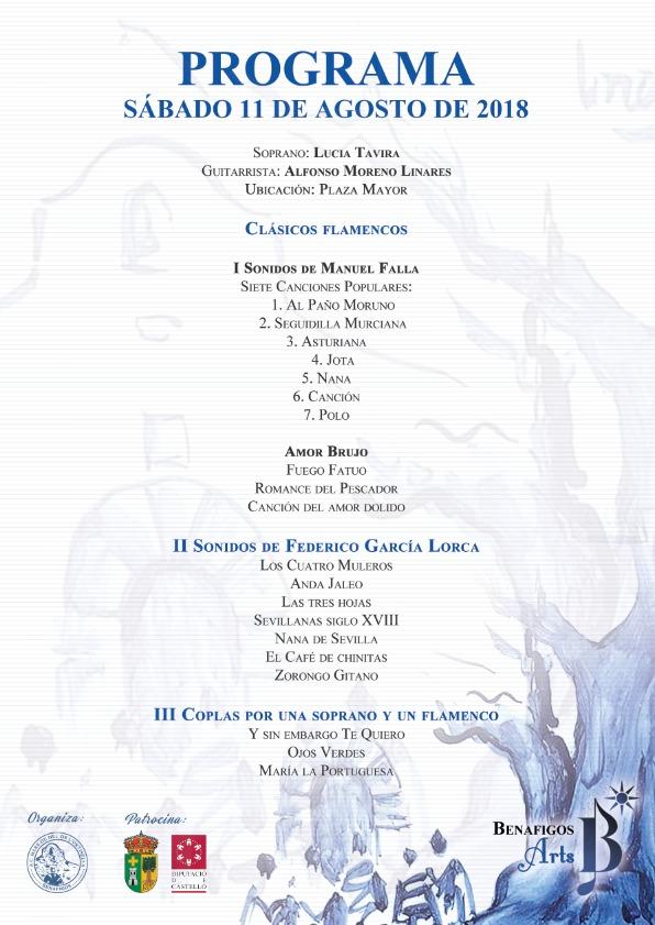 El próximo sábado 11 de agosto Benafigos vivirá la segunda de las jornadas de este innovador festival y prevé repetir el éxito de la primera noche, que congregó a más de 300 personas en la plaza de la Iglesia en torno a un excepcional concierto de gala inaugural con sopranos y tenores. Esta semana a las 19:00 horas habrá una presentación del concierto a cargo del periodista Vicente Cornelles. Posteriormente, a las 19:30 horas comenzará 'El Embrujo  en la Voz', concierto de voz y guitara a cargo de la soprano Lucía Tavira,y el guitarrista Alfonso Moreno Linares. Una actuación que tendrá lugar en la Plaza Mayor de Benafigos.