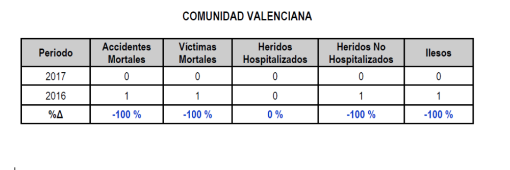 También en lo que llevamos del año 2017, hasta el 9 de abril, el número de accidentes en las carreteras valencianas ha descendido un 19%, pasando de 30 accidentes mortales en 2016 a los 23 accidentes mortales de este año. Mientras que el número de fallecidos también se ha reducido en un 23 %, de las 30 víctimas mortales de 2016 a las 23 en lo que llevamos de año.