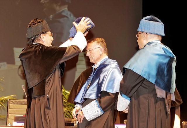 La Universitat Jaume I ha investido hoy como doctor honoris causa al matemático Pierre Arnaud Raviart, a propuesta del Instituto Universitario de Matemáticas y Aplicaciones de Castelló y del Departamento de Matemáticas, por su trayectoria humana, académica y profesional en el ámbito de la matemática aplicada y sus contribuciones en el campo de la modelización matemática. El acto ha estado presidido por el rector, Vicent Climent; el rector honorario de la UJI, Francisco Michavila; el rector de la Universidad Politécnica de Madrid, Carlos Conde; el presidente del Consejo Social, José Luis Breva; el secretario general de la Jaume I, José Luis Breva; la vicerrectora de Internacionalización, Cooperación y Multilingüismo, Inmaculada Fortanet y el vicerrector de Investigación y Doctorado, Antoni Barba.