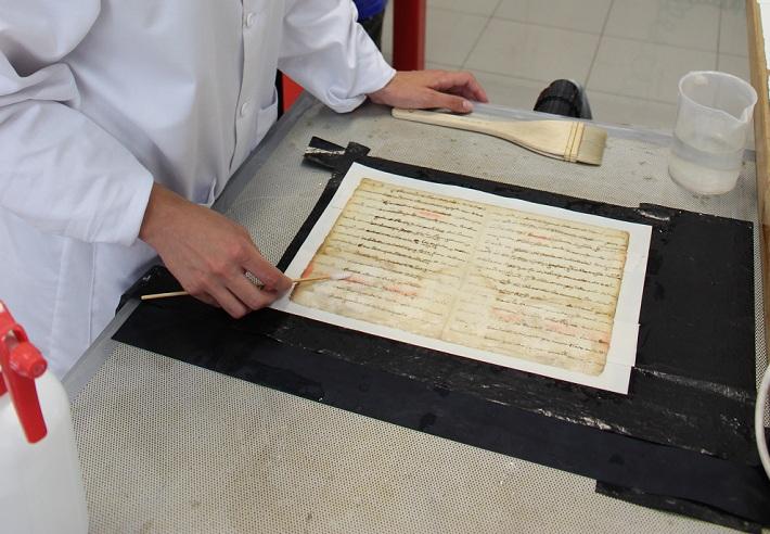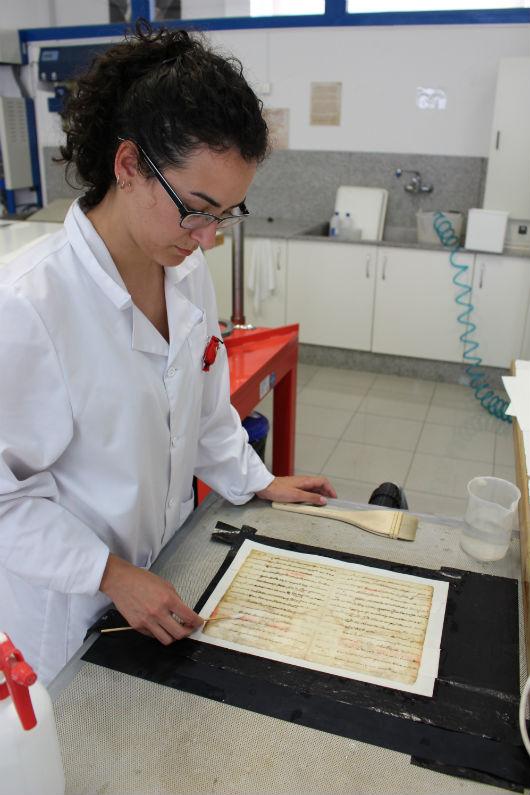El proceso principal de esta intervención ha sido la limpieza, tanto en seco como en medio acuoso. Con estas técnicas se han podido eliminar las manchas superficiales y otras más incrustadas como manchas de humedad y de tintas rojas, que dificultaban y entorpecían la lectura del texto. También se han eliminado las deformaciones causadas por pliegues en las hojas y se han reparado los rasgados y pérdidas de soporte, con injertos de papeles de características similares al original. Para finalizar la intervención, todas las piezas fueron cosidas y almacenadas individualmente en cajas de conservación realizadas a medida.