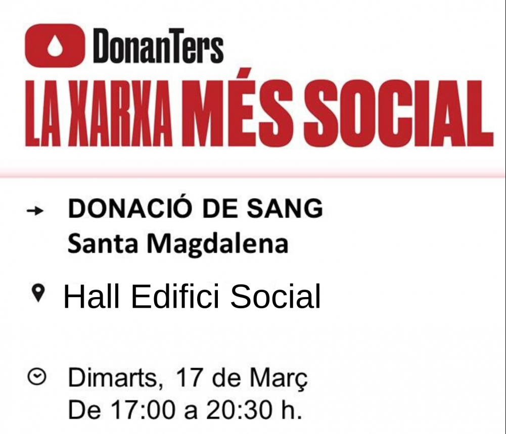 El Centre de Transfusions de Castelló informa que, demà dimarts 17 de març, realitzarà una jornada de donació de sang a Santa Magdalena i ho farà de 17.00 a 20.30h, en el Hall de l'Edifici Social, ja que el consultori auxiliar metge ha d'estar tancat al públic, en virtut del RD 463/2020 de 14 de març.
