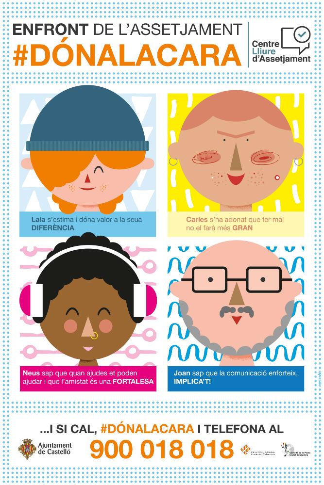 La campaña, indicaba Enric Porcar, parte de una idea, un cartel, que recoge, de forma gráfica, los estereotipos que simbolizan la campaña. El cartel se centra en la idea de que “ante el acoso escolar es necesario dar la cara y que toda la comunidad educativa se implique. Hemos elegido ilustraciones dirigidas específicamente a los adolescentes y hemos convertido el lema de la campaña, #Dónalacara en un hashtag que nos permita hacer difusión de la misma a través de redes sociales”. Y ha añadido: “los personajes que aparecen en el cartel simbolizan los cuatro papeles que existen en una situación de acoso: el acosado, el acosador, el observador y el entorno y a cada uno le hemos dado una frase y un mensaje en positivo” para revertir esa situación de acoso.