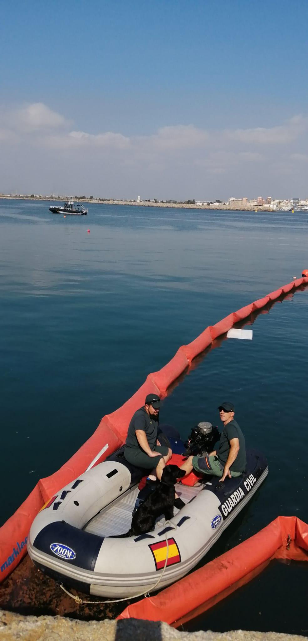 Según ha informado la Guardia Civil, desde ayer ambos animales de la Unidad Cinológica Central de la Dirección General de la Guardia Civil con sede en El Pardo (Madrid), también olisquean el agua para poder localizar el cuerpo del portuario desaparecido, ya que son capaces de detectar restos humanos hasta 50 metros de profundidad.