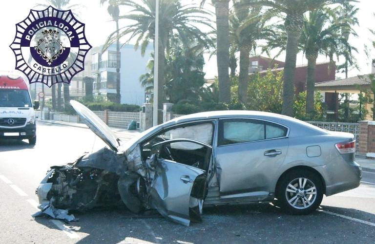 La Policía Local de Castellón junto con un retén de bomberos municipales y una ambulancia intervinieron ayer por la tarde en un aparatoso accidente de tráfico en el que estuvieron implicados dos turismos y resultaron heridos los dos conductores. El siniestro se produjo sobre las 14:30 cuando por causas que está investigando el equipo de Atestados e Investigación de Accidente, un Toyota Avensis embistió lateralmente a un Volkswagen Golf que circulaba unos metros por delante en la Avenida Ferrandis Salvador frente a la playa del Serradal. Como consecuencia de la fuerte colisión, tanto el Volkswagen Golf como el Toyota Avensis perdieron el control de la dirección y tras invadir ambos el sentido contrario y golpear varias palmeras, finalmente los dos turismos se quedaron atravesados en la calzada.