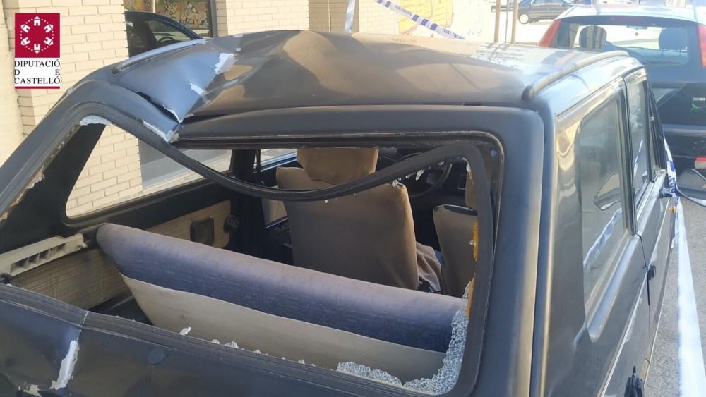 Una cristalera ha caído desde un balcón hasta la vía pública en Benicarló. La caída del cristal ha destrozado dos coches que estaban estacionados en la vía pública. Además, también se ha retirado una persiana que también presentaba riesgo de caer.