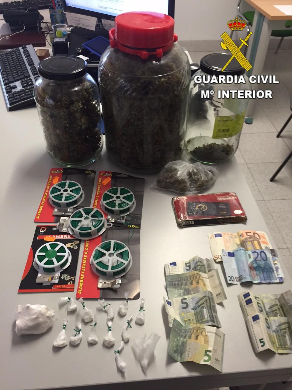 Así mismo se hallaron en el vehículo varias dosis de cocaína. A raíz de esto se inició una investigación, gracias a la cual se incautaron un total de 52 gramos de cocaína y 620 gramos de marihuana, así como utensilios para la preparación de las dosis. Por todo ello, se procedió a la detención de dos varones, de 48 y 60 años de edad y nacionalidad española, como supuestos autores de un delito de tráfico de drogas