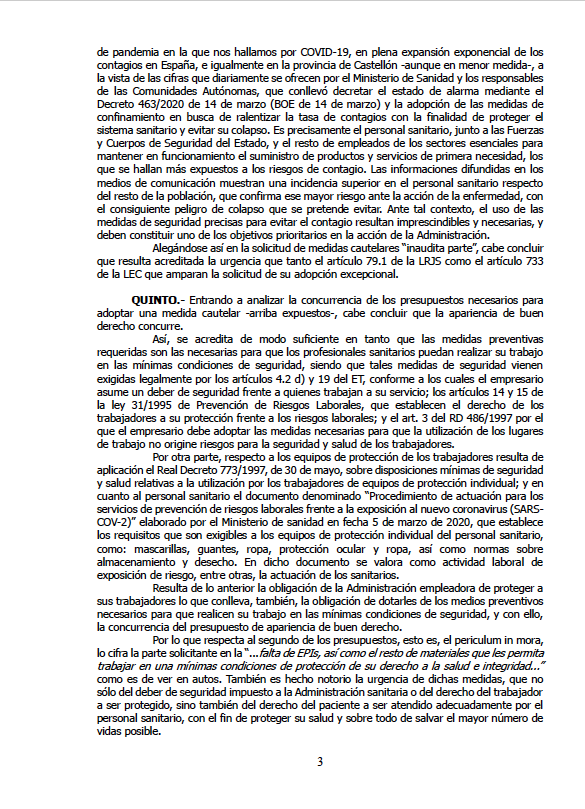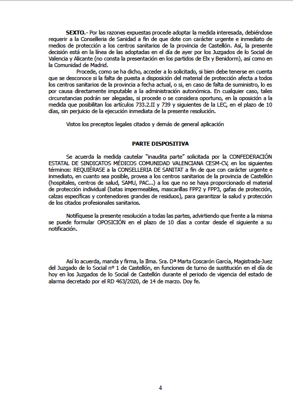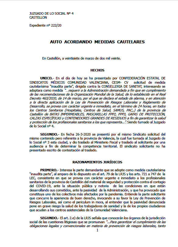 La medida cautelar ‘inaudita parte’ se ha adoptado en respuesta a las denuncias interpuestas por la Confederación Estatal de Sindicatos Médicos de la Comunitat Valenciana Cesm-CV, “en cumplimiento de las recomendaciones de la Organización Mundial de la Salud, de lo establecido en el Real Decreto 463/2020, de 14 de marzo, por el que se declara el estado de alarma, y en atención a la directa aplicación de la Ley de Prevención de Riesgos Laborales y Reglamento de Desarrollo, se provea con carácter urgente e inmediato, en el término de 24 horas, en todos los Centros Sanitarios (Hospitales, Centros de Salud, Samus, Pac,.) de la provincia de Castellón de batas impermeables, mascarillas FPP2, FPP3, gafas de protección, calzas específicas y contenedores grandes de residuos a fin de garantizar la salud y protección de los profesionales sanitarios a los que representa...”.