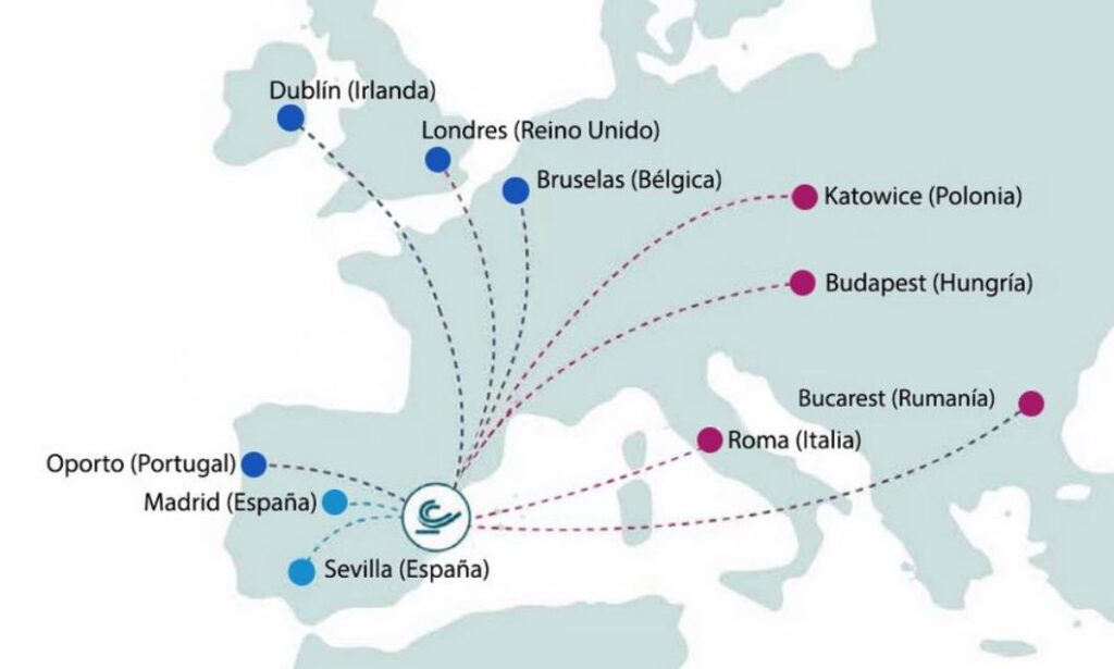 Las aerolíneas con las que trabaja son Iberia (Madrid y Sevilla), Ryanair (Londres, Bruselas, Dublín y Oporto) y Wizzair (Bucarest, Budapest, Katowice y Roma).
