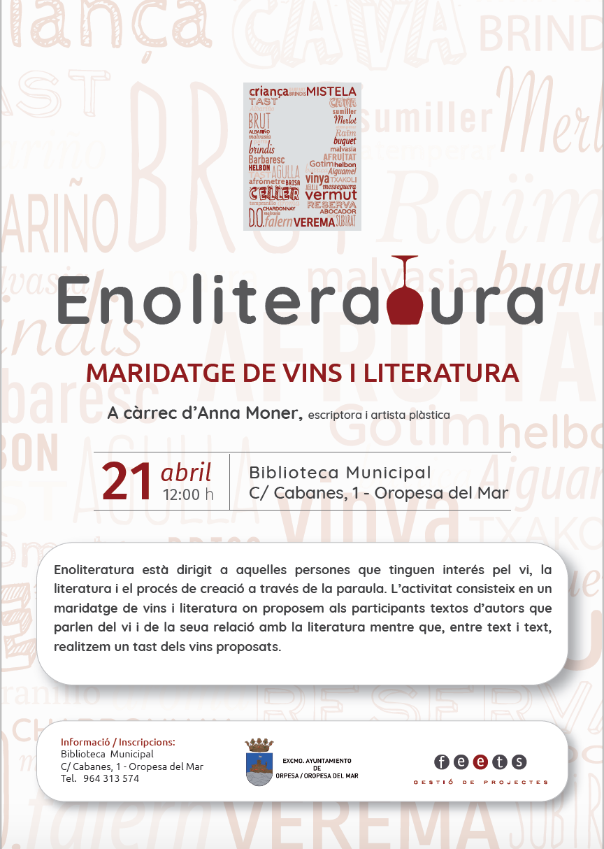 Captura de pantalla 2018-04-14 a las 12.17.26Así, el día 21 se celebrará el taller ‘Enoliteratura’, una sesión en el que se maridarán vinos y textos a cargo de la escritora y artista plástica Anna Moner. La actividad va dirigida a aquellas personas que tengan interés por el vino, la literatura y el proceso de creación a través de la palabra: desde que nace la inspiración, la idea o la anécdota hasta que se escribe el texto y se da a conocer a los demás. Los participantes leerán textos cortos de diferentes autores que hablen del vino y de su relación con la literatura. Entre lectura y lectura, se realizará una cata de los vinos propuestos.