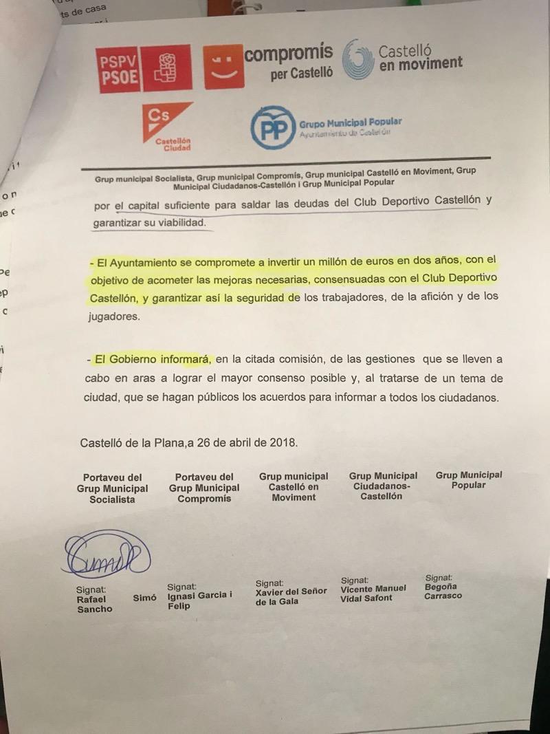 Y también: “La relación entre el CD. Castellón y el Ayuntamiento, como propietario del estadio Castalia, debe ser entendida en clave de ciudad, independientemente del partido que gobierne en cada momento. Y el Ayuntamiento de Castellón, está en disposición de redactar un nuevo convenio de cesión de dichas instalaciones al emblemático club castellonense”.