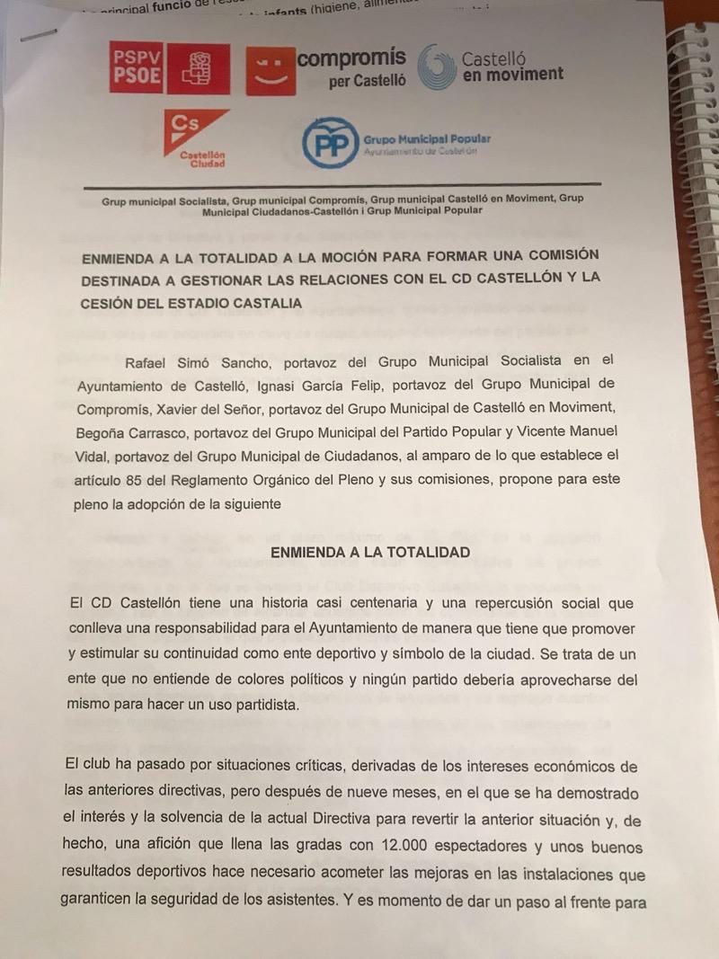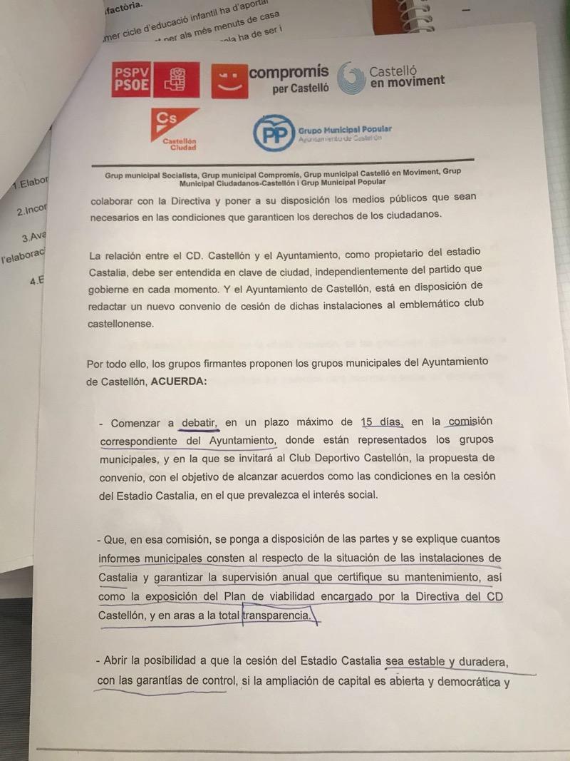 "Comenzar a debatir, en un plazo máximo de 15 días, en la comisión correspondiente del Ayuntamiento, donde están representados los grupos municipales, y en la que se invitará al Club Deportivo Castellón, la propuesta de convenio, con el objetivo de alcanzar acuerdos como las condiciones en la cesión del Estadio Castalia, en el que prevalezca el interés social.