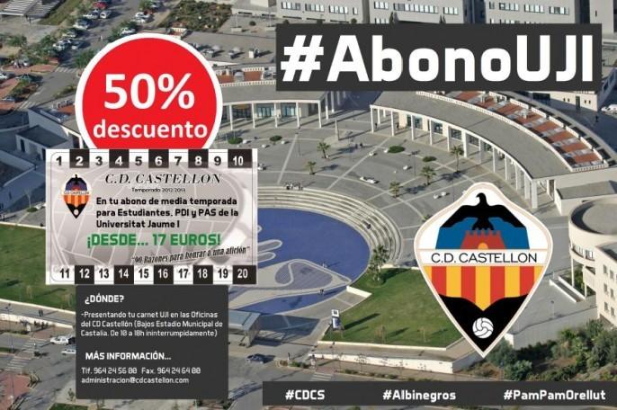 Por este motivo, desde la entidad de la capital de la Plana se quiere en este tramo crucial de temporada hacer un llamamiento a toda la afición albinegra y, en especial, a toda la comunidad universitaria de la universidad pública de la capital de La Plana (Estudiantes, PDI y PAS), a la que ofertan una promoción especial: la posibilidad de abonarse al Castellón con un 50% de descuento en los precios de la campaña de abonos de media temporada, por lo que cualquier miembro de la Universitat Jaume I puede ser socio del equipo ‘orellut’ con precios que van desde los 17 euros (en la zona de Gol) a los 50 euros en Tribuna Alta Central (40 si eres joven).