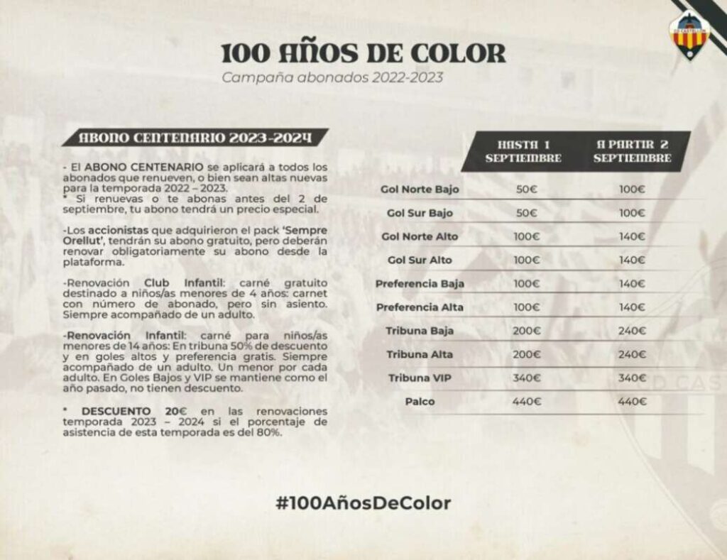 La nueva campaña de abonados del CD Castellón para la temporada 2022-23 llega de la mano del centenario del club. Para premiar la fidelidad de la afición, el club ha ideado el 'Abono Centenario, 100 años de color', en el cual todos los aficionados del equipo albinegro podrán adquirir este abono con los mismos precios del Abono Centurión, unos precios asequibles tanto para las renovaciones como para las nuevas altas.