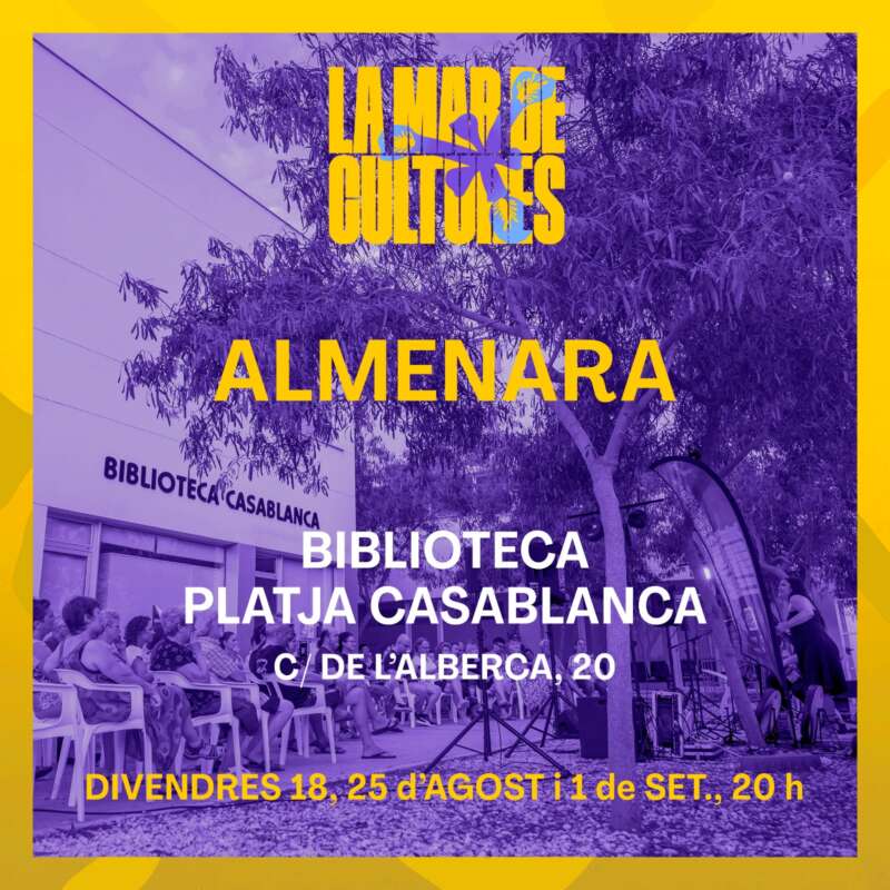 A partir del pròxim divendres 18 d'agost a les 20 hores, el Centre Cultural Miguel Hernández de la Platja Casablanca d'Almenara (Biblioteca) acollirà la quarta edició del cicle de concerts “La Mar de Cultures” que començarà amb l'actuació Magalí Sare & Manel Fortià i que seguirà amb Riuh el divendres 25 i Aigua el divendres 1 de setembre.