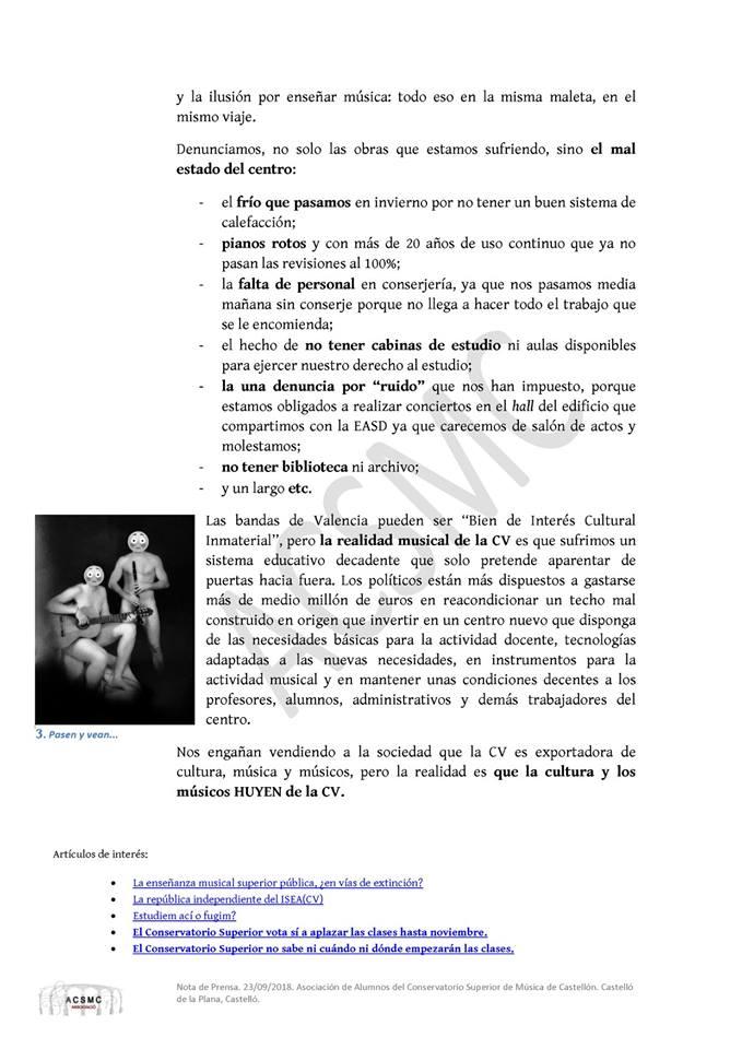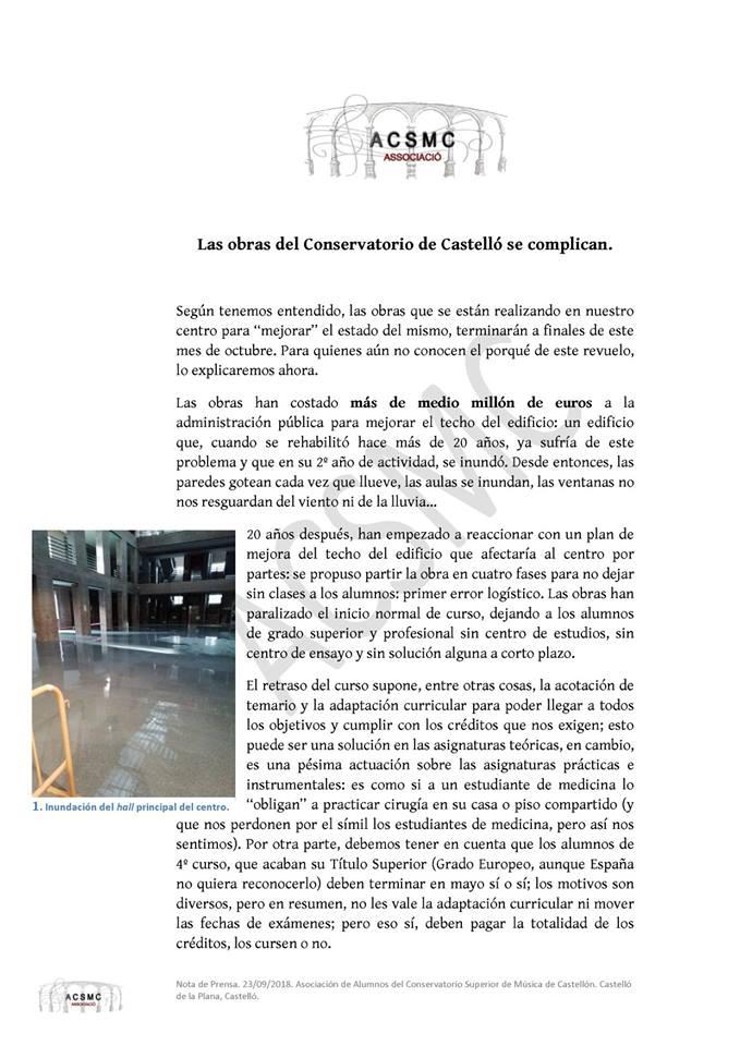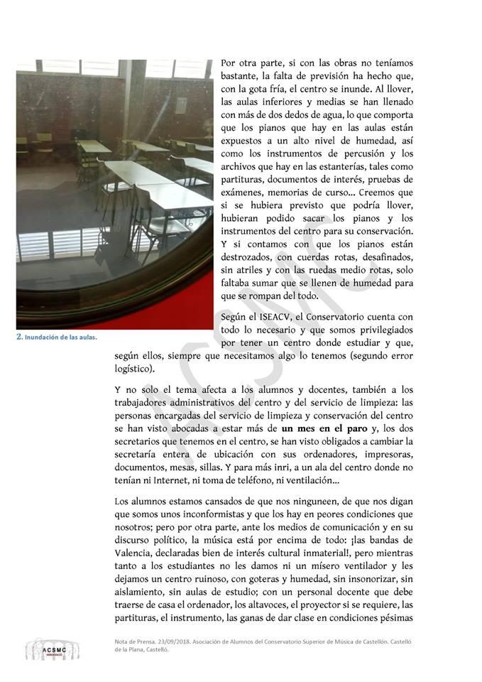 "La Admaecv (Asociación de Docentes de Música y Artes Escénicas de la Comunitat Valenciana) quisiera con este comunicado apoyar a la Asociación de Alumnos del Conservatorio Superior de Música de Castellón (Acsmc) en su denuncia ante los hechos que se están sufriendo en el Conservatorio Superior de Música de Castellón en relación, tristemente, al estado en el que se encuentran las instalaciones de dicha institución y que repercutirá en un retraso de al menos un mes en la reanudación de su actividad lectiva.
