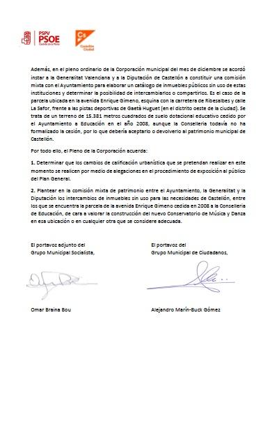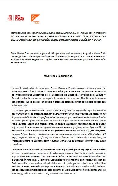 Así las cosas, PP presentaba una moción para defender el Conservatorio en su solar original de Taxida. CS se destapaba con una declaración institucional que proponía un solar municipal en avenida Enrique Gimeno para el Conservatorio, que solo le aplaudió el PSOE y se quedó sobre la mesa. Y CS y PSOE sorprendían a propios y extraños con una enmienda a la totalidad de la moción del PP, que ni siquiera había sido dada a conocer a Compromís y Podem (los socios de PSOE en el Acuerdo de Fadrell) antes de la Junta de Portavoces del lunes.