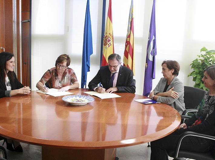 El rector de la Universitat Jaume I, Vicent Climent, ha presidido este mediodía la firma del convenio de colaboración entre la Fundación Isonomia y el Ayuntamiento de Almassora. En el acto han participado la alcaldesa de Almassora, Susanna Nicolau; la concejala de Igualdad del consistorio, Merche Galí; la vicerrectora de Igualdad, María José Oltra; y María José Ortí, coordinadora de la Fundación Isonomia.
