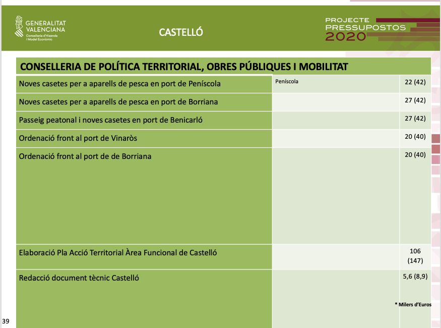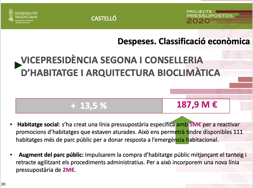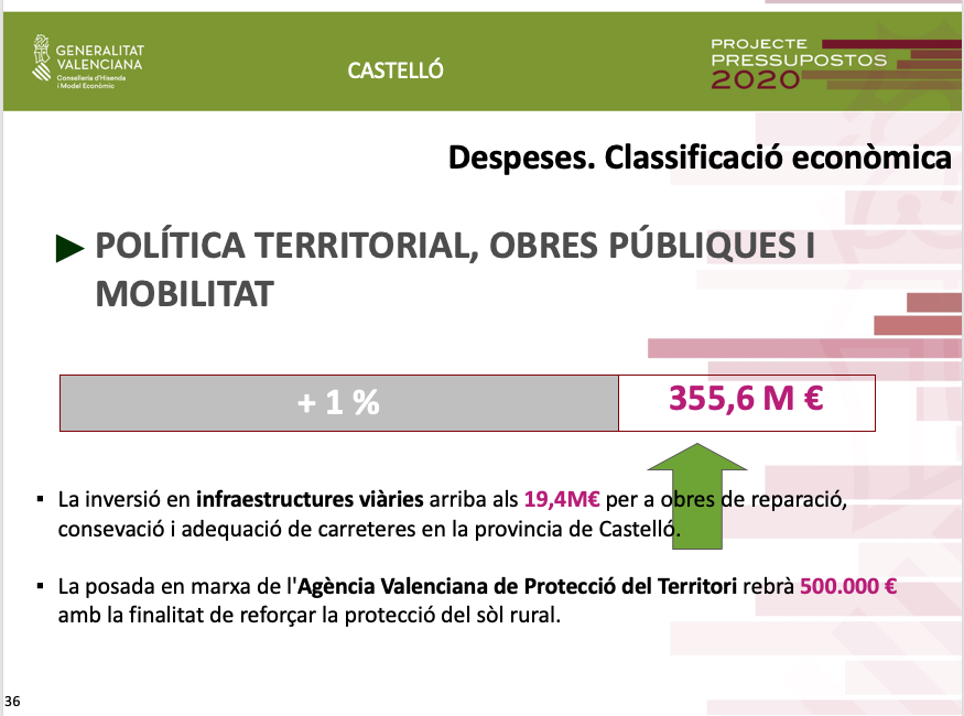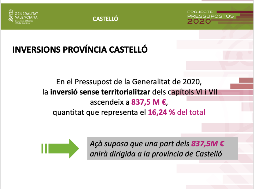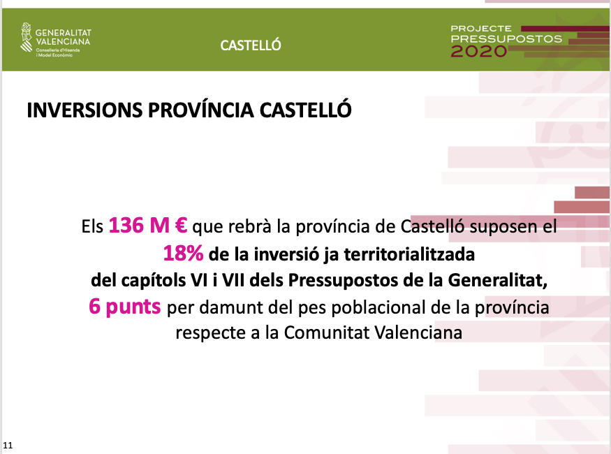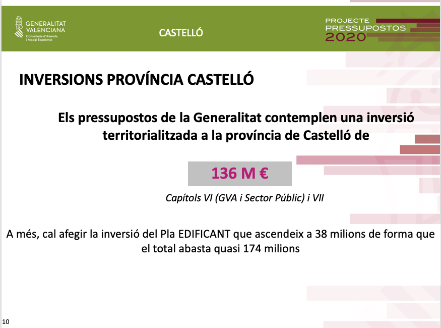 Pel que fa als pressupostos de 2020 per a Castelló, Soler ha assenyalat que a més de la inversió de 136 milions d'euros, és a dir un 18% de la inversió total ja territorialitzada, es destinaran altres 38 milions d'euros al Pla Edificant, que no estaven territorialitzats.