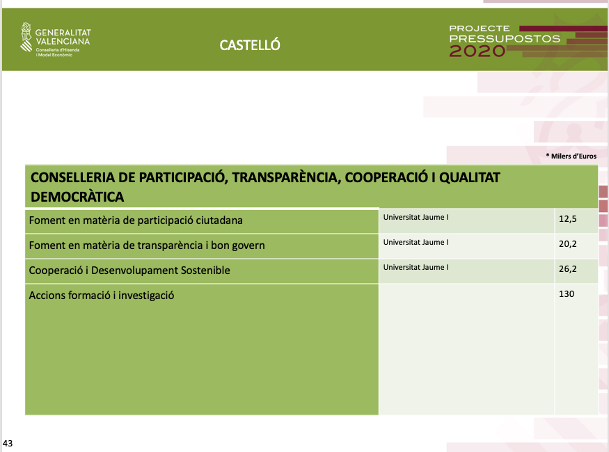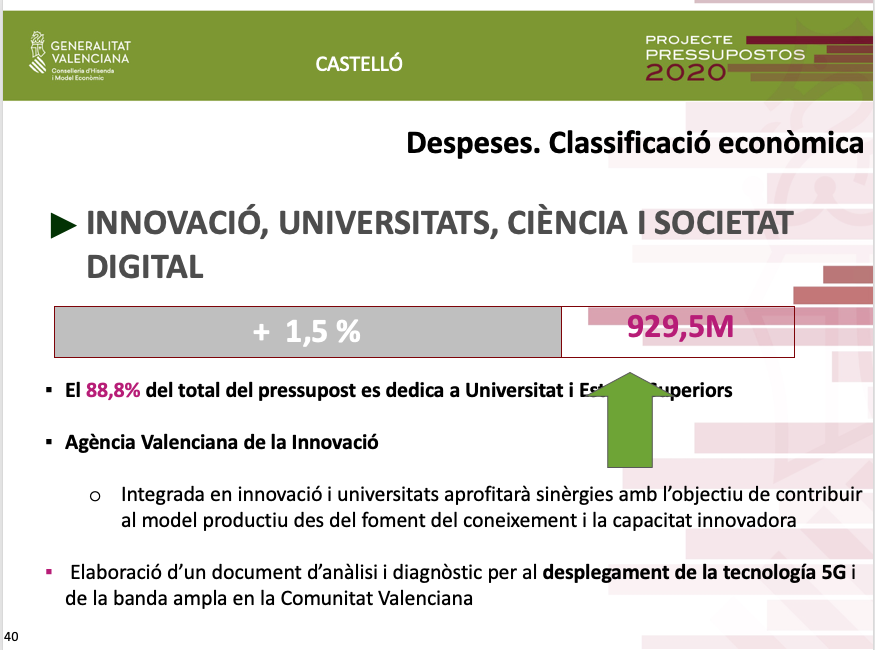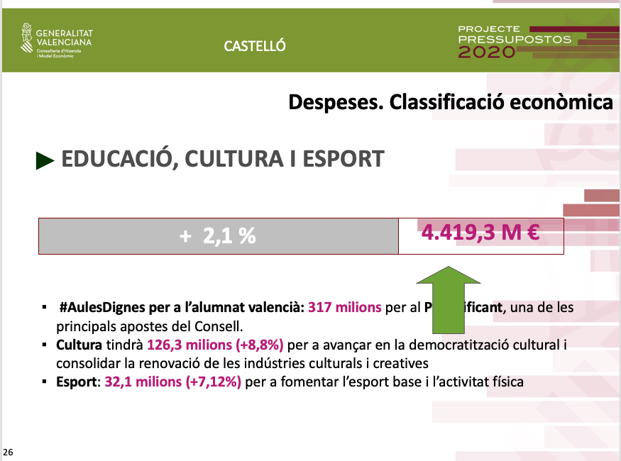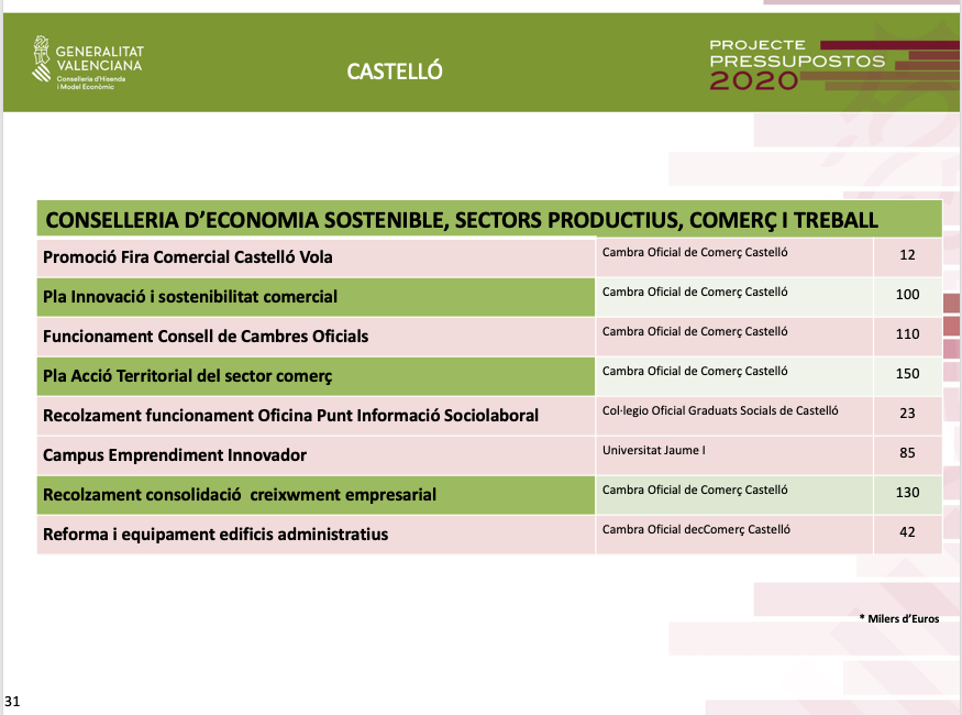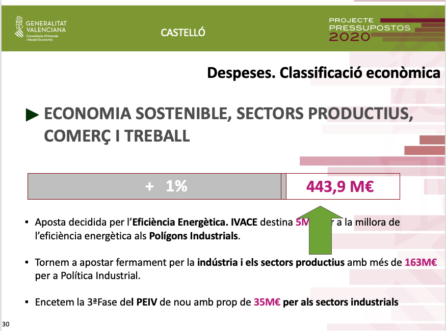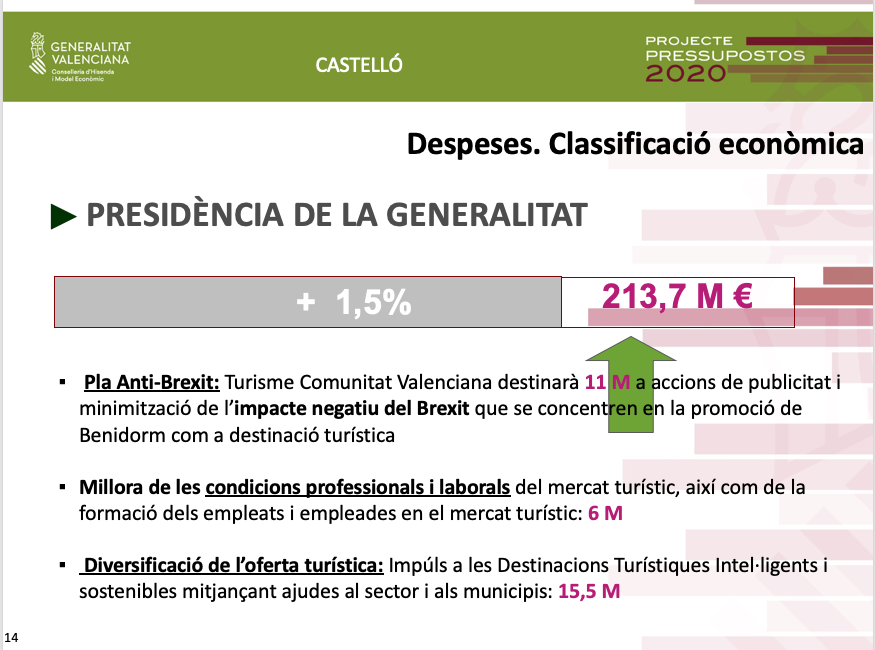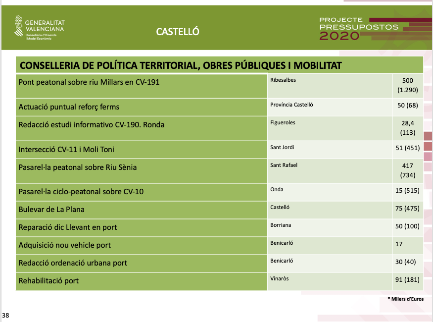 Pel que fa als pressupostos de 2020 per a Castelló, Soler ha assenyalat que a més de la inversió de 136 milions d'euros, és a dir un 18% de la inversió total ja territorialitzada, es destinaran altres 38 milions d'euros al Pla Edificant, que no estaven territorialitzats.