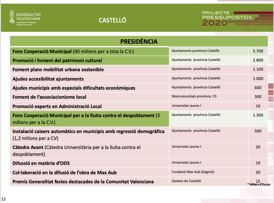 A fi de continuar donant suport al municipalisme i lluitar contra la despoblació, l'àrea de Presidència destinarà als ajuntaments de Castelló 5,7 milions d'euros del Fons de Cooperació, 1,3 milions del Fons de Cooperació Municipal de lluita contra la despoblació, 2,8 milions d'euros per a la promoció i el foment del patrimoni cultural, i 1,1 milions d'euros per al foment de plans de *mobilidad urbana sostenible.