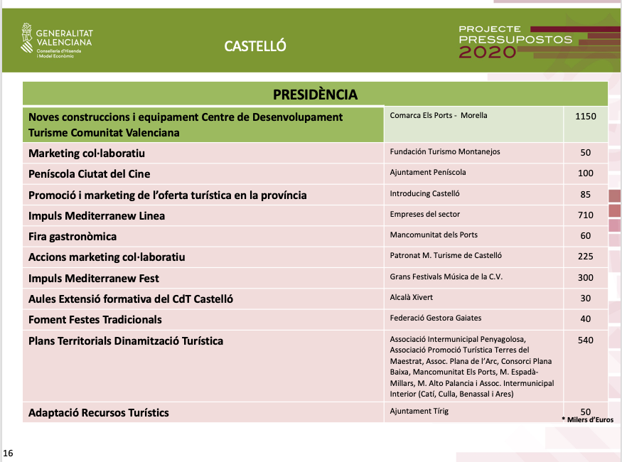 Finalment cal destacar que s'ha previst destinar 1,1 milió d'euros a construcció i equipament del Centre de Desenvolupament Turístic de la comarca dels Ports.