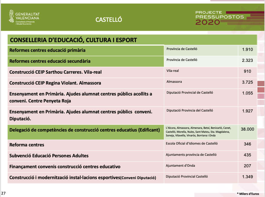 Entre els centres inclosos en els pressupostos destaca el CEIP Regina Violant d'Almassora o el CEIP Sarthou Carreres de Vila-real, així com delegacions de competències als Ajuntaments per a construir centres a l'Alcora, Almassora, Almenara, Betxí, Benicarló, Canet, Castelló, Morella, Nules, Sant Mateu, Santa Magdalena, Soneja, la Vilavella, Vinaròs, Borriana i Onda.
