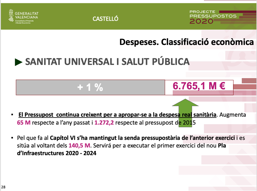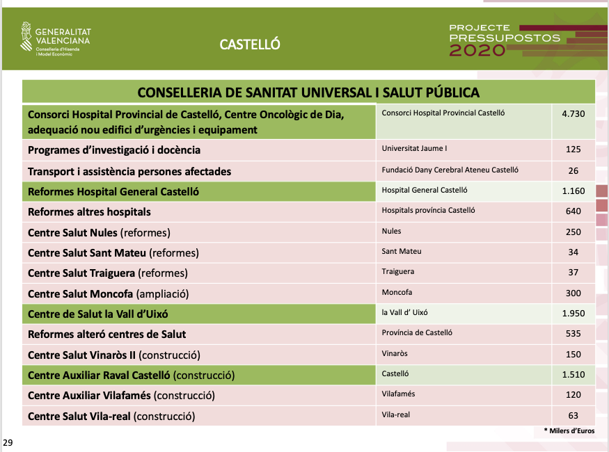 En matèria d'inversions en Sanitat, la major part es destinen a la reforma i ampliació de diferents hospitals i centres de salut de la província, que permetran entre altres actuacions essencials la finalització del Centre Oncològic de Dia i l'adequació del nou edifici d'Urgències de l'Hospital Provincial, amb una inversió de 4,7 milions d'euros; el Centre de Salut de Vall d'Uixó, amb 1,9 milions d'euros; o el Centre Auxiliar de Salut de Raval de Castelló, per al que es destinarà 1,5 milions d'euros.