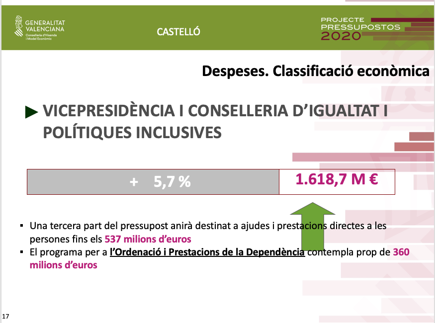"Es tracta per tant, ha diu Soler, dels millors pressupostos que pot tindre la província de Castelló per a garantir la prestació de serveis socials com la sanitat, l'educació i l'atenció a la dependència i estic convençut que establiran les bases del creixement econòmic del territori, duent a terme polítiques d'inversió en sectors estratègics, sense deixar de costat en cap moment els sectors tradicionals. L'objectiu no és un altre que impulsar el creixement econòmic, la creació d'ocupació i el benestar de les castellonenques i els castellonencs", ha conclòs el conseller Soler.