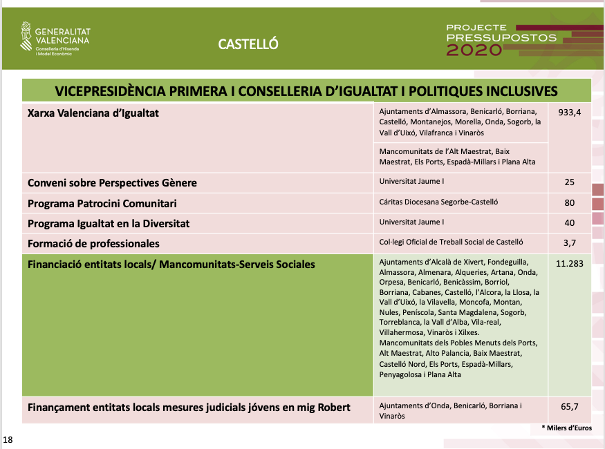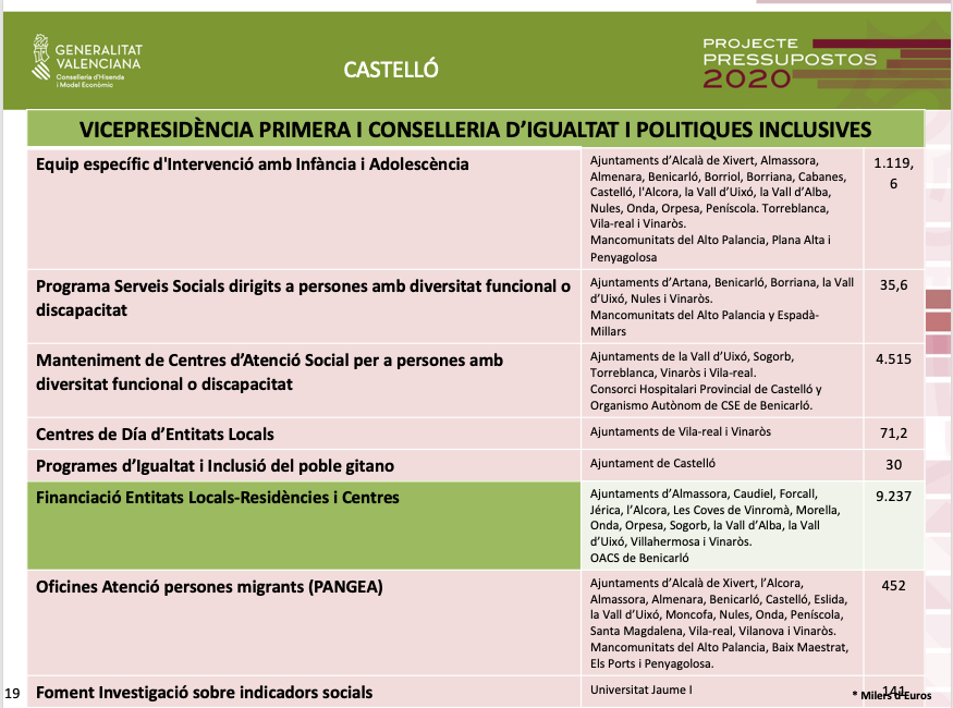 A més, en matèria de serveis socials, els pressupostos contemplen destinar 11,2 milions d'euros per a finançar 30 entitats locals i 9 mancomunitats; així com 1,1 milions d'euros per a equips específics d'intervenció en infància i adolescència en 18 municipis i 3 mancomunitats. Dins dels pressupostos de la Conselleria d'Igualtat i Polítiques Inclusives també es contempla destinar 9,2 milions d'euros per a residències i centres adscrits a Ajuntaments, i 4,5 milions d'euros al manteniment de centres d'atenció social per a persones amb diversitat funcional o discapacitat.