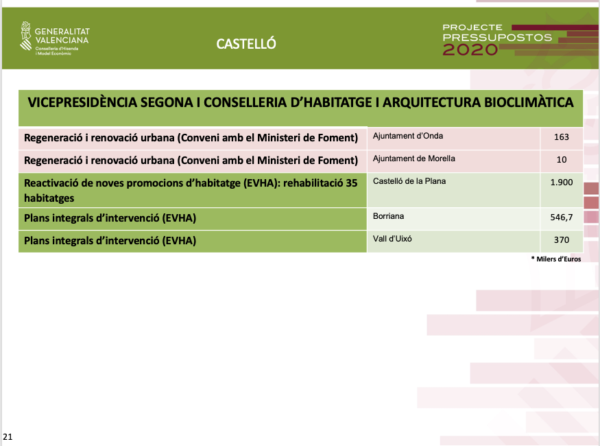 Entre les actuacions en l'àrea d'Habitatge, els pressupostos preveuen 1,9 milions d'euros en la rehabilitació de 35 habitatges a Castelló de la Plana, prop d'un milió d'euros per a plans integrals d'intervenció a Borriana i Vall d'Uixò.