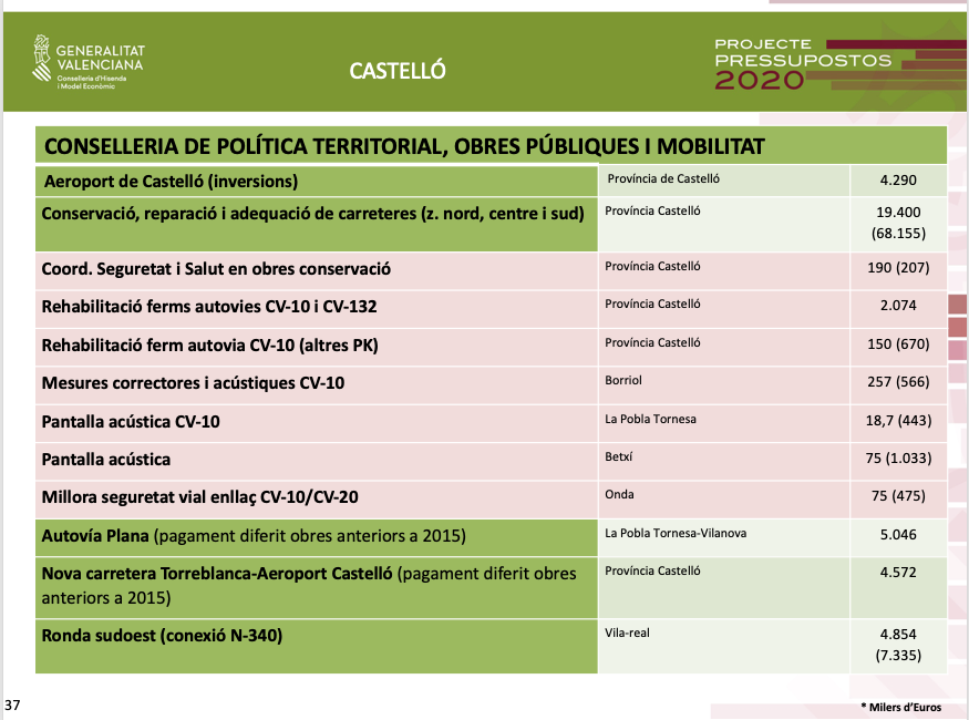 En matèria de Política Territorial, Obres Públiques i Mobilitat, es destinarà 4,8 milions d'euros a la Ronda Sur-oest de Vila-real, i 4,2 milions d'euros a inversions en el Aeopuerto de Castelló, amb la finalitat que comence a funcionar com una autèntica eina per al turisme. Així mateix, es contemplen 19,4 milions d'euros per a conservació, reparació i adequació de carreteres, i altres 9,5 milions d'euros per al pagament diferit de l'anterior govern per a dur a terme l'autovia La Plana i la carretera Torreblanca-Aeroport de Castelló.