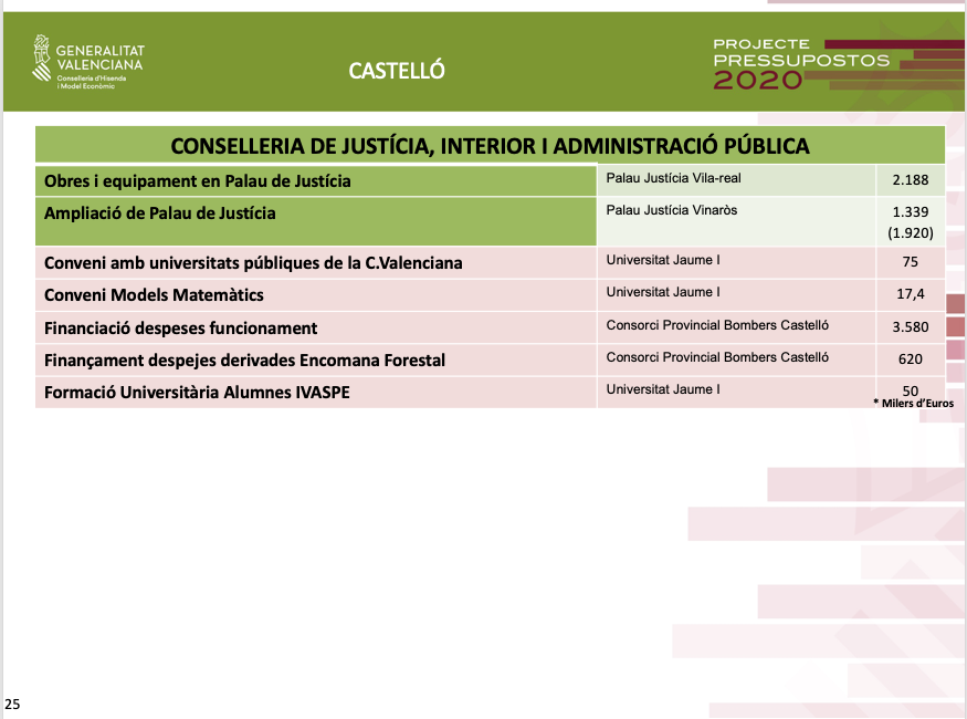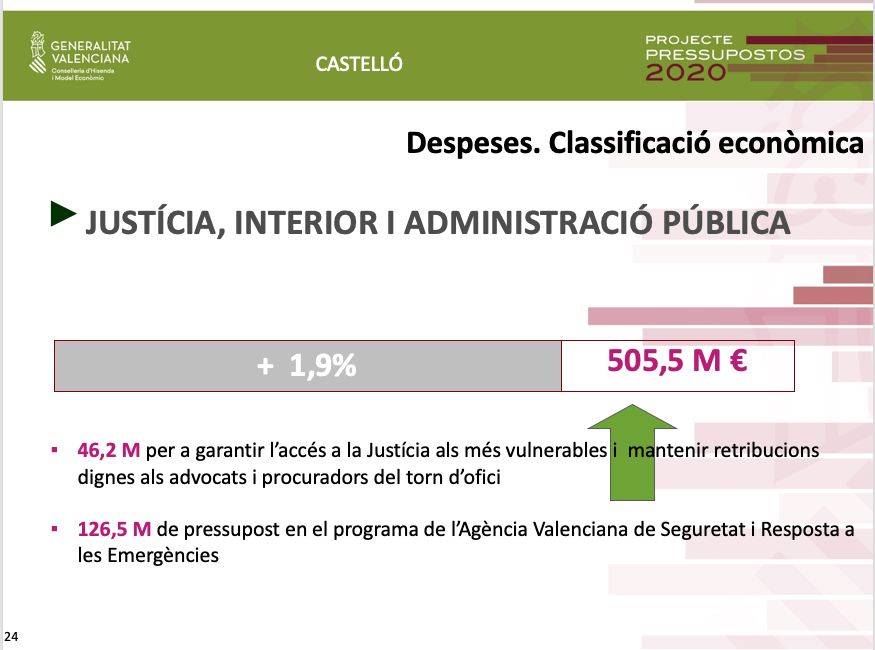 En l'àrea de Justícia, els pressupostos contemplen 2,1 milions d'euros en obres d'equipament en el Palau de Justícia de Vila-real, i 1,3 milions d'euros per a l'ampliació del Palau de Justícia de Vinaròs.
